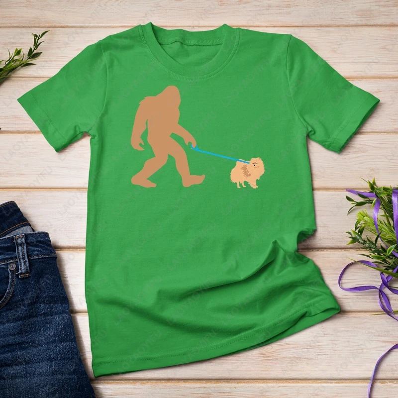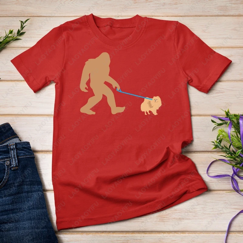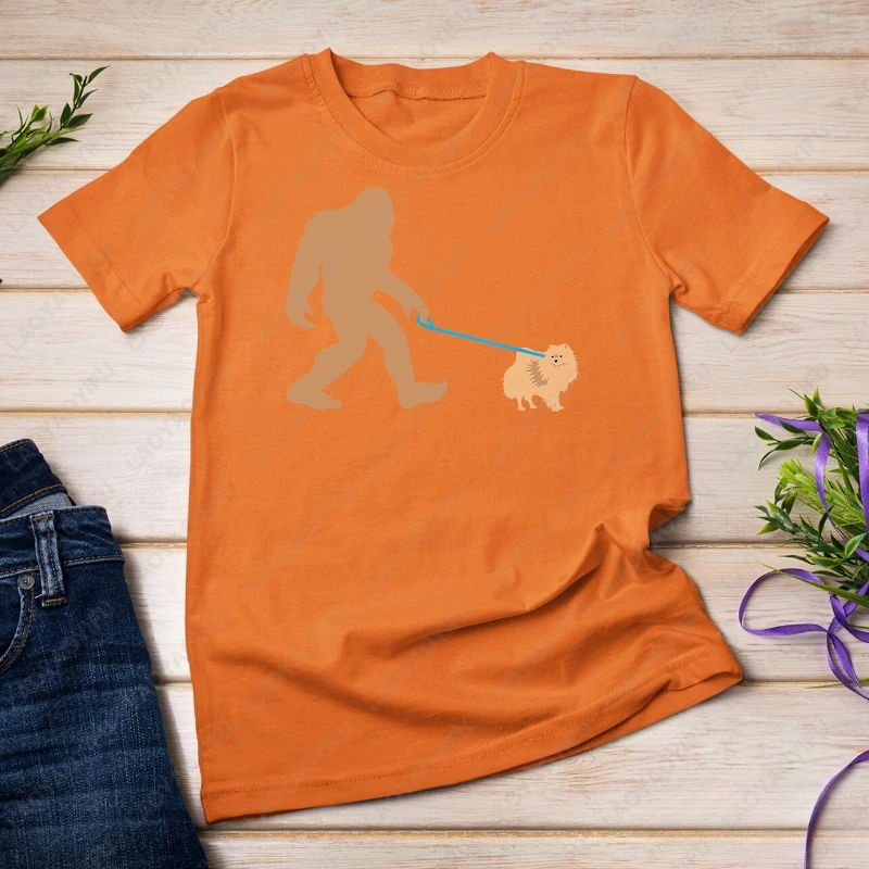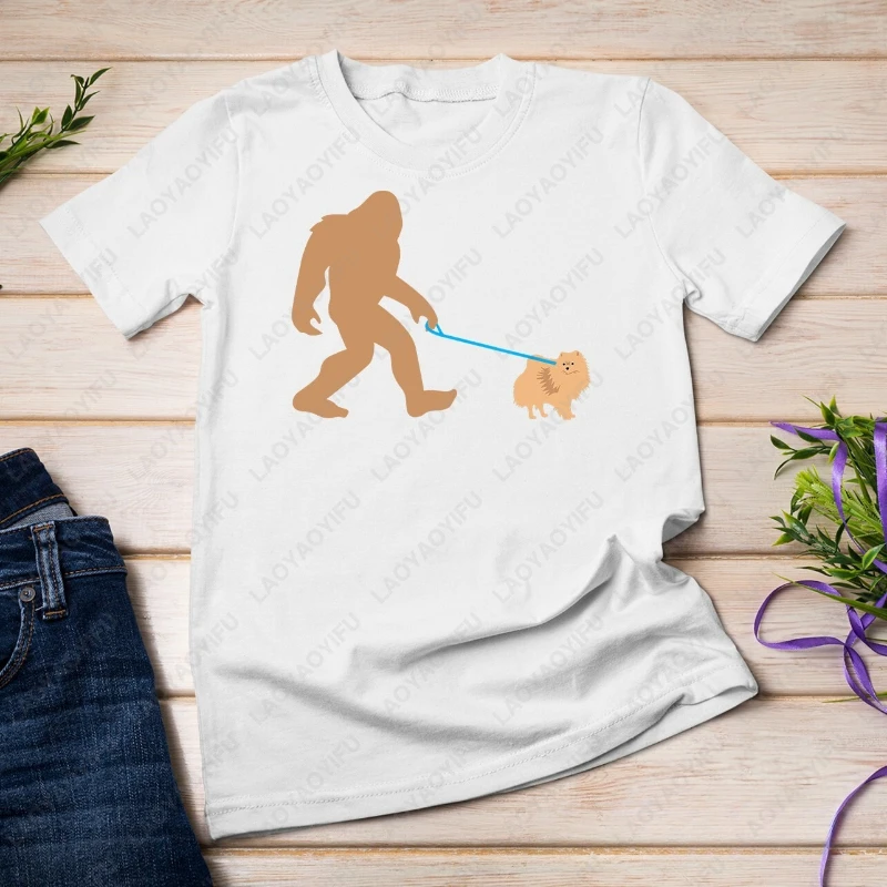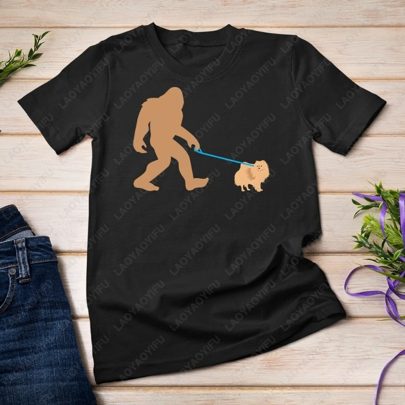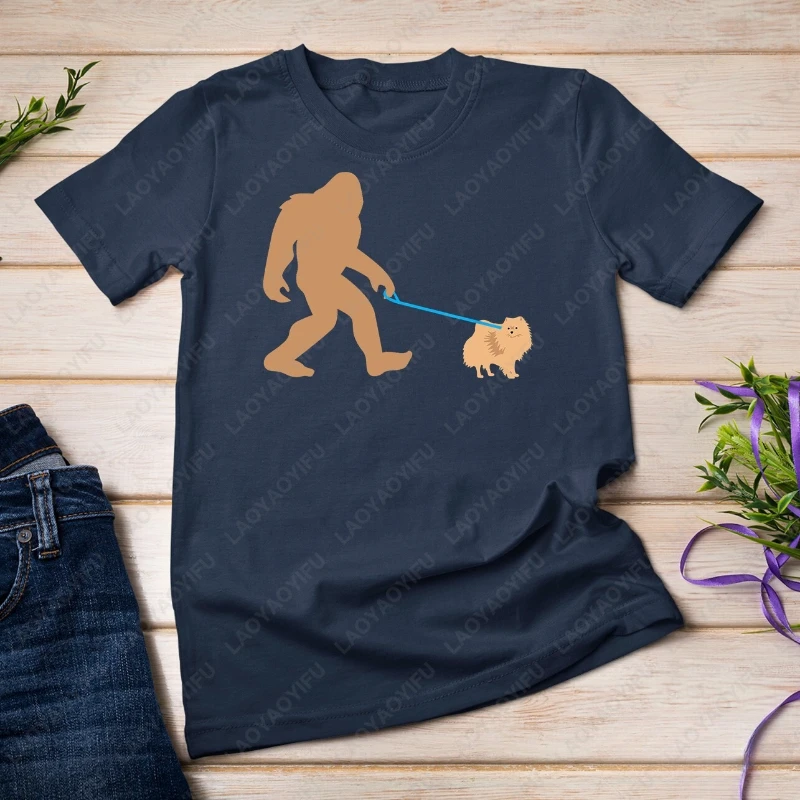 Bigfoot Walk The Dog Pomeranian Funny Sasquatch Gift Unisex Tshirt